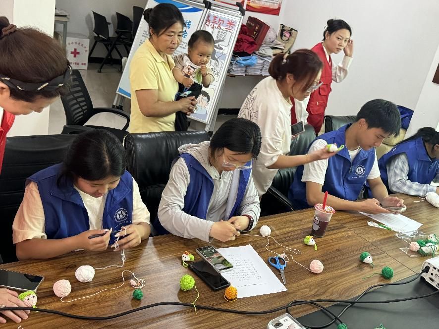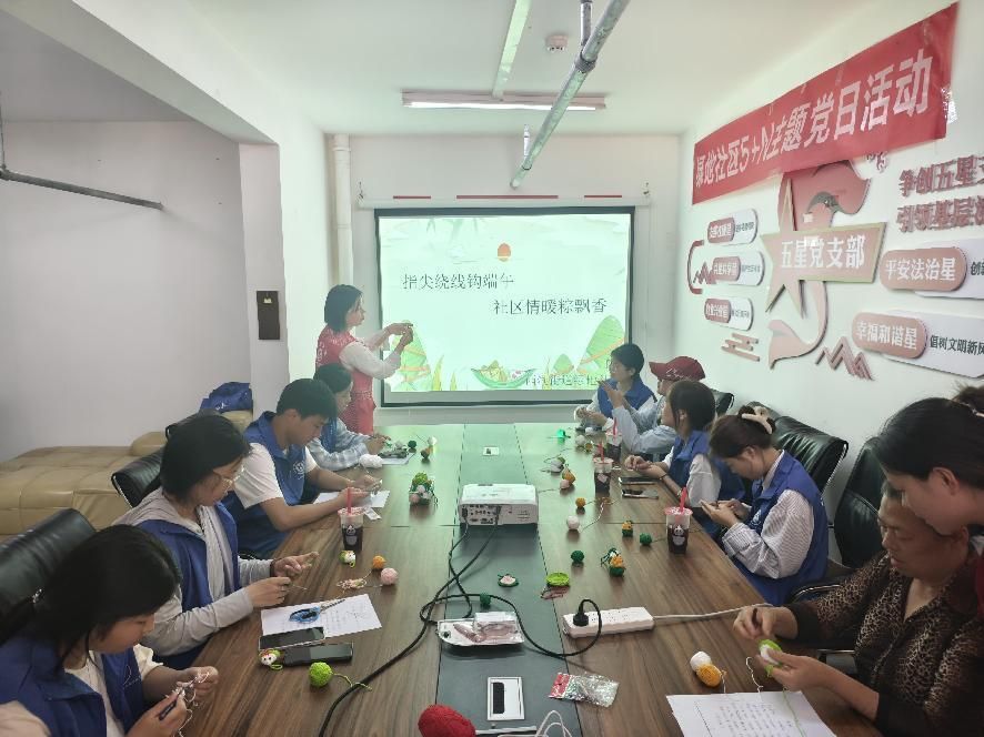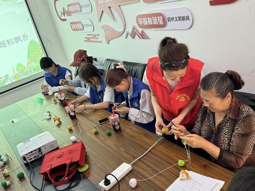 她们在进行“指尖绕线钩端午 社区情暖棕飘香”的活动,心灵手巧的工作人员笑意盈盈地围坐在我们身旁,手把手教我们用五彩斑斓的毛线钩织粽子。柔软的毛线在指尖缠绕、跳跃,随着钩针灵活穿梭,一个个小巧玲珑、憨态可掬的毛线粽子逐渐成型。那场景温馨又美好,仿佛编织的不仅是粽子,更是一段充满欢乐与创意的美好回忆。