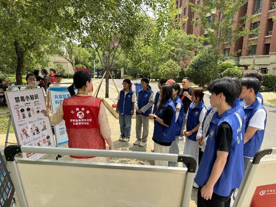 此次活动增强了同学们对毒品危害的认识,提高防毒拒毒意识,社区联合河南对外经济贸易职业学院电子商务学院青年志愿者服务队,在社区户外场地进行,现场布置了多块禁毒知识宣传展板,内容涵盖“禁毒小知识”“新型毒品的种类”等。社区志愿者为志愿者服务队成员及现场居民详细讲解展板知识,以图文并茂的形式,生动介绍毒品的特征、危害,以及防范毒品的方法。志愿者们认真聆听,不时提问交流,现场学习氛围浓厚。未来电商学院将进一步丰富志愿者活动形式,拓展宣传时间和空间,持续和巩固扩大宣传效果,为社区安全稳定保驾护航。
