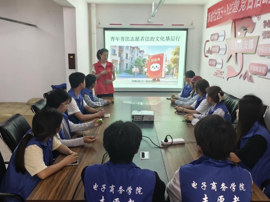 图中是“青年普法志愿者法治文化基层行”活动场景 。该活动旨在深入基层,向广大群众传播法治文化。通过志愿者的讲解、观看视频等形式,让民法典等法律知识走进社区、乡村等地,提升基层群众的法律意识和法治观念,营造良好的法治氛围 ,促进基层法治建设。