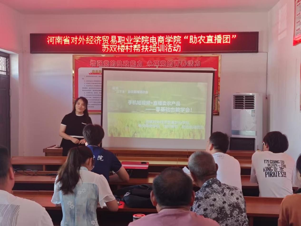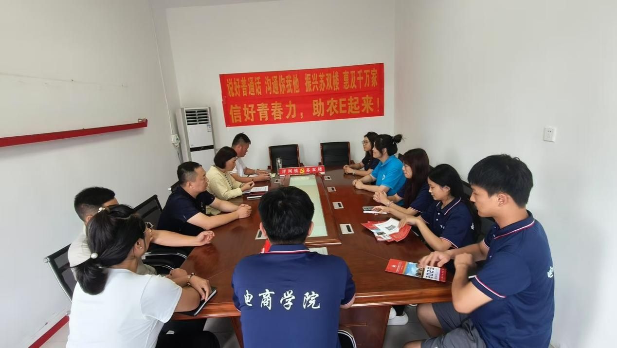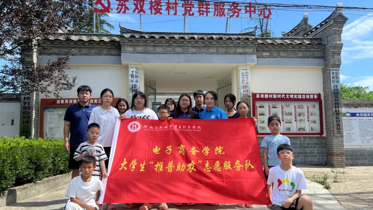 6月25日,由我院团总支书记赵静老师带队、各专业学生组成的推普助农志愿团队深入信阳市洋河镇苏双楼村,开展了以"电商助农促振兴,推普教育润童心"为主题的暑期社会实践。实践期间,团队师生克服酷暑天气,紧密围绕乡村振兴战略,充分发挥电子商务专业优势,成功为当地农户搭建了农产品直播销售平台。