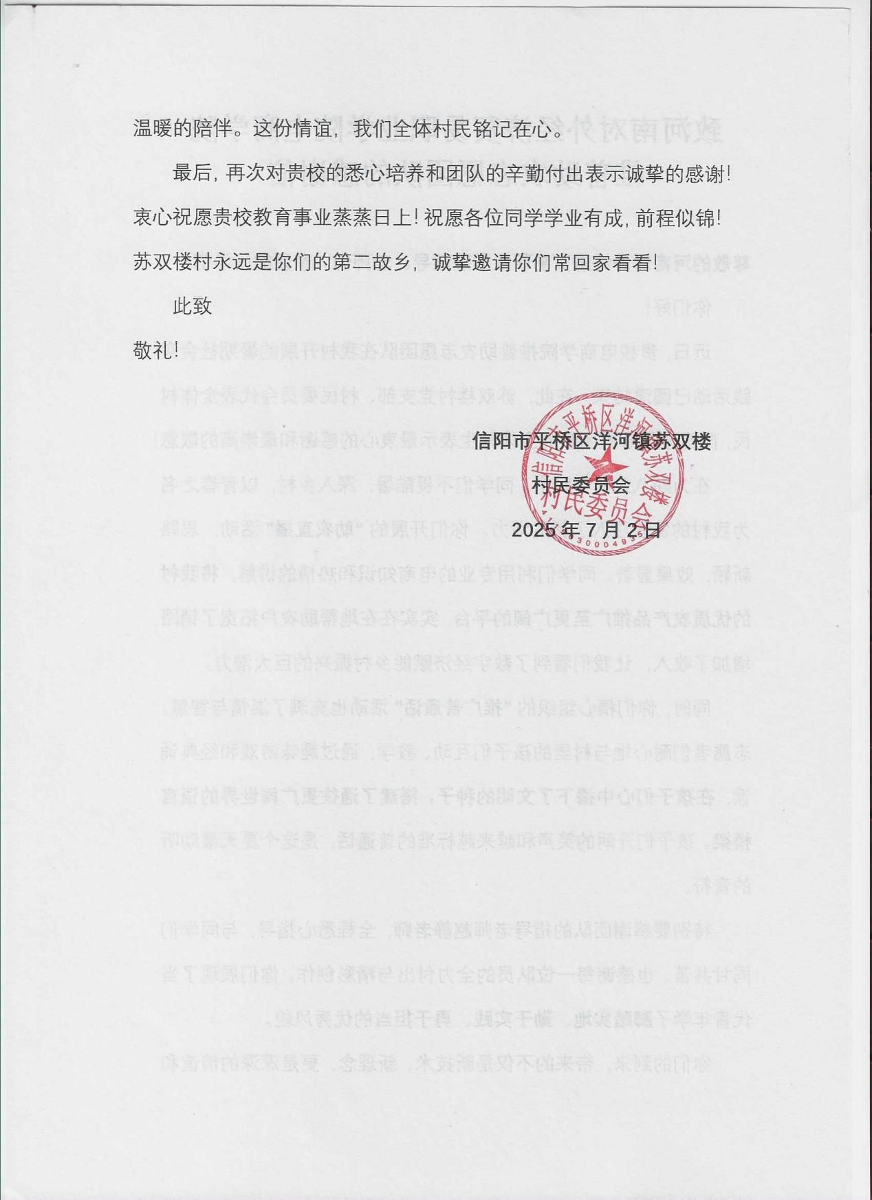 感谢信中对我院师生展现出的"脚踏实地、勤于实践、勇于担当的优秀风貌"给予了高度评价。信末,苏双楼村村委会诚挚地写道:"苏双楼村永远是你们的第二故乡,诚挚邀请你们常回家看看!"