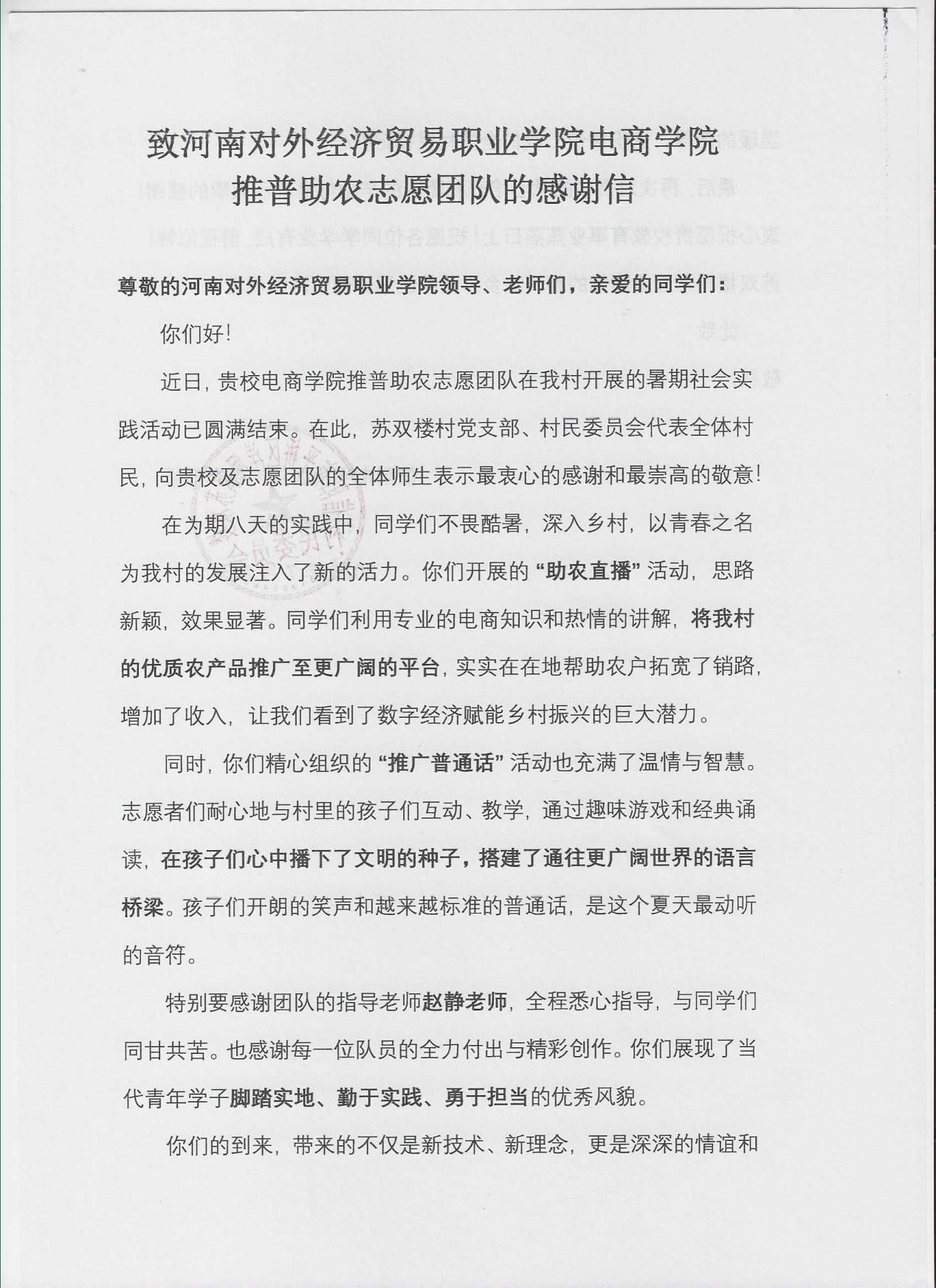 近日,我院收到一封来自信阳市洋河镇苏双楼村村民委员会的感谢信,信中对我院推普助农志愿团队在暑期社会实践中的出色表现和积极贡献给予了高度评价和衷心感谢。