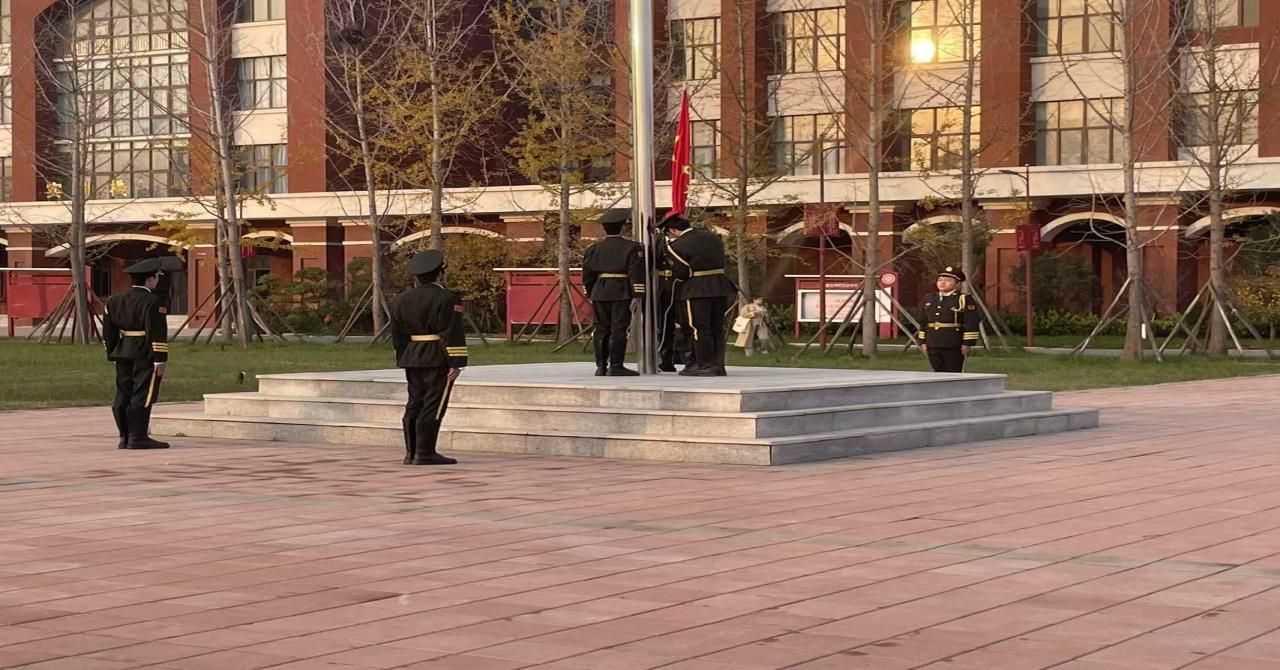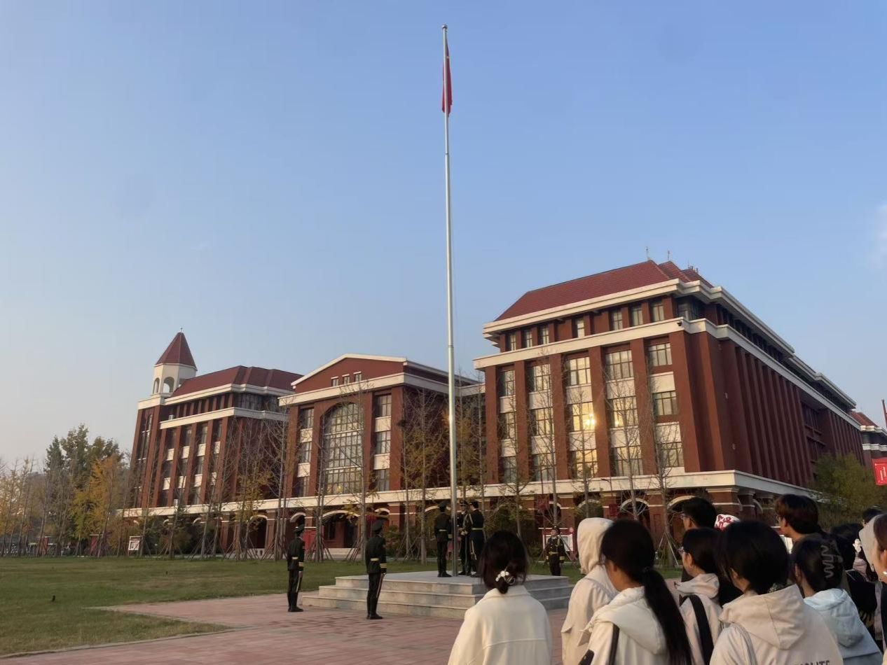 上午七点半,升旗仪式正式开始。学院国旗护卫队的同学们迈着铿锵有力、整齐划一的步伐,护卫着鲜艳的五星红旗走向升旗台。全场师生庄严肃立,目光紧随国旗。伴随着雄壮激昂的《义勇军进行曲》,升旗手振臂一挥,五星红旗迎风展开,在全场师生的注目下冉冉升起,在湛蓝的天空中猎猎飘扬。这一刻,强烈的民族自豪感和爱国情怀在每一位师生心中激荡。
