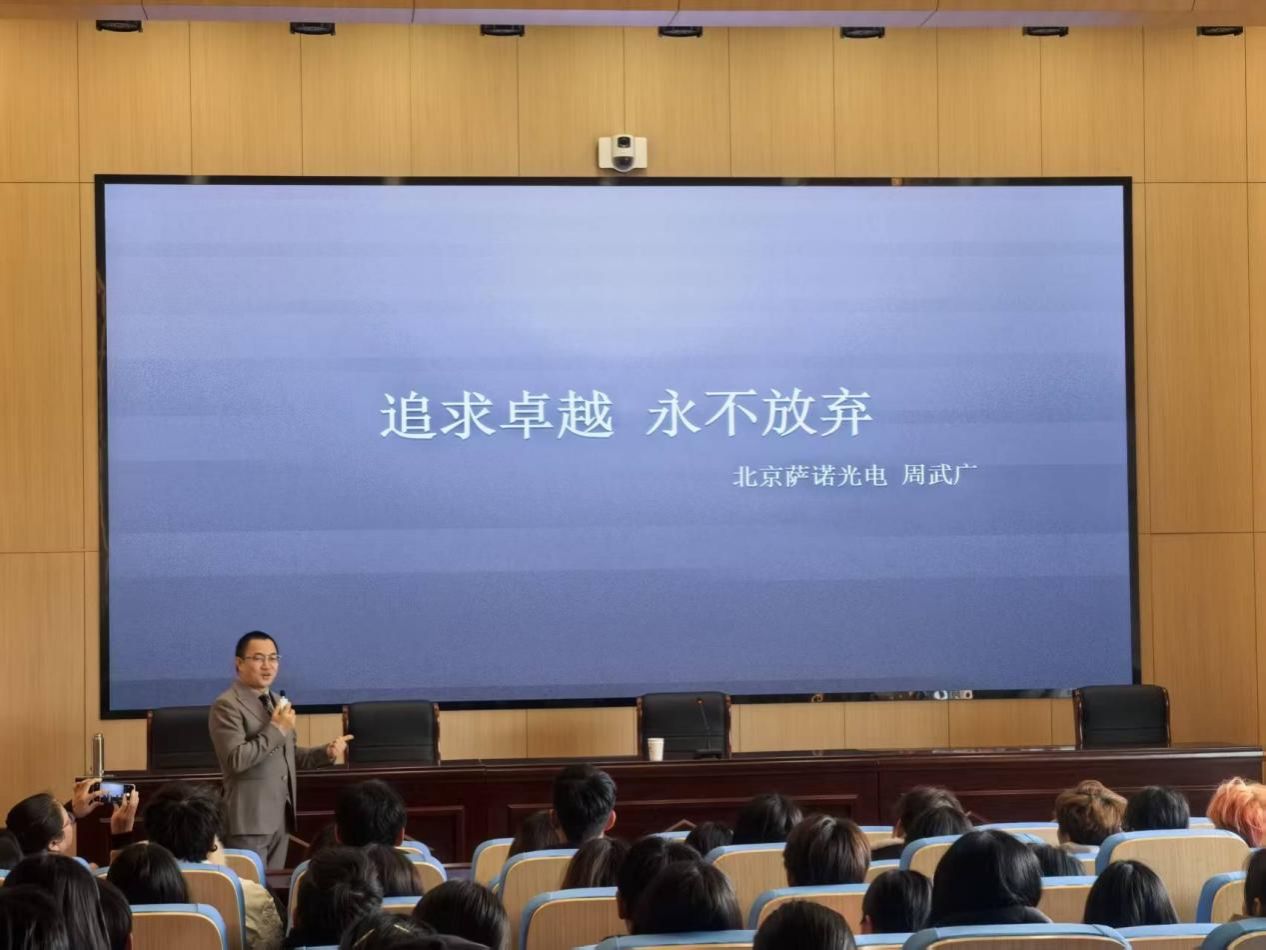 2025年12月9日下午两点,由电子商务学院与国际经贸学院联合主办的“追求卓越 永不放弃”创业主题讲座在开封校区教学楼二楼学术报告厅成功举办。本次讲座特邀北京萨诺光电科技发展有限公司董事长周武广先生担任主讲嘉宾,两院共计120余名师生到场聆听。
