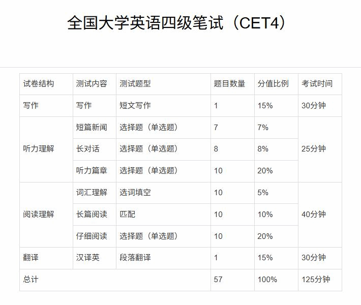 3.阅读理解(共30题,考试时间40分钟)①词汇理解(10题)根据文章后面给出的15个单词填补文章里的10个空格。②段落匹配(10题)每句所含的信息出自篇章的某一段落,要求考生找出与每句所含信息相匹配的段落。有的段落可能对应两题,有的段落可能不对应任何一题。③仔细阅读(10题,2篇)题材广泛,可以包括人物传记、社会、文化、日常知识、科普常识等,但是所涉及的背景知识应能为学生所理解。阅读理解部分的目的是测试学生通过阅读获取信息的能力,既要求准确,也要求有一定速度。