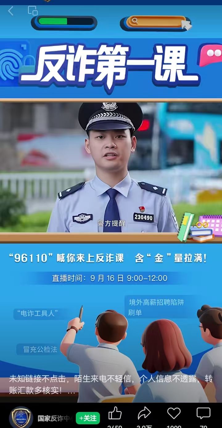 杨老师:在央视频APP收看了“反诈第一课”。短短半小时,却像被当头棒喝。警官用真实案例拆解“刷单返利”“冒充客服”套路:骗子先给小利,再制造“卡单”恐慌,诱导不断转账。未知链接不点、个人信息不留、转账前“四问”。我记下反诈专线96110,也把“国家反诈中心”App装进父母手机。