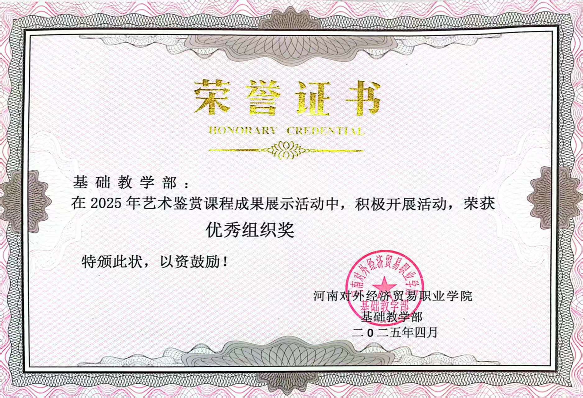 基础教学部在2025年艺术鉴赏课程成果展示活动中,积极承办活动,荣获优秀组织奖。