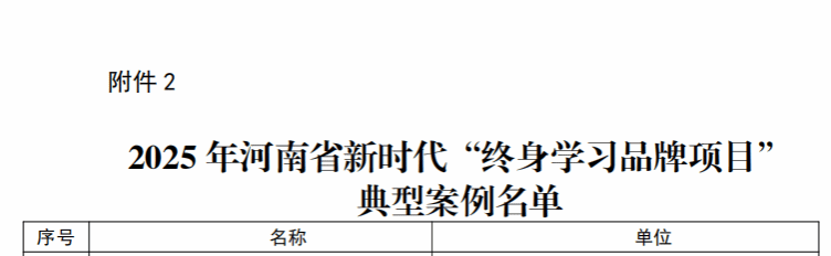 我院精心打造的 “美成在久学习社”被认定为2025 年河南省新时代“终身学习品牌项目”。该社是我院为“传承经典文化,涵养终身学习风尚”而精心打造的文化教育项目,通过校园晨读、社会公益读书会、特殊时期学习等形式,累计举办活动达189期,参与群体涵盖学生、成人、社区居民、职业人员等,参与人数超 5000 人次,获得了多方的广泛赞誉。