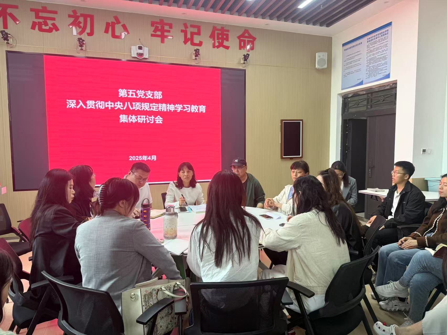 为加强作风建设,进一步贯彻落实中央八项规定精神,4月25日下午,第五党支部在实训楼1004教室召开专题学习会。会议由党支部书记霍爱萍主持,开封校区全体党员教师、入党积极分子参加会议。