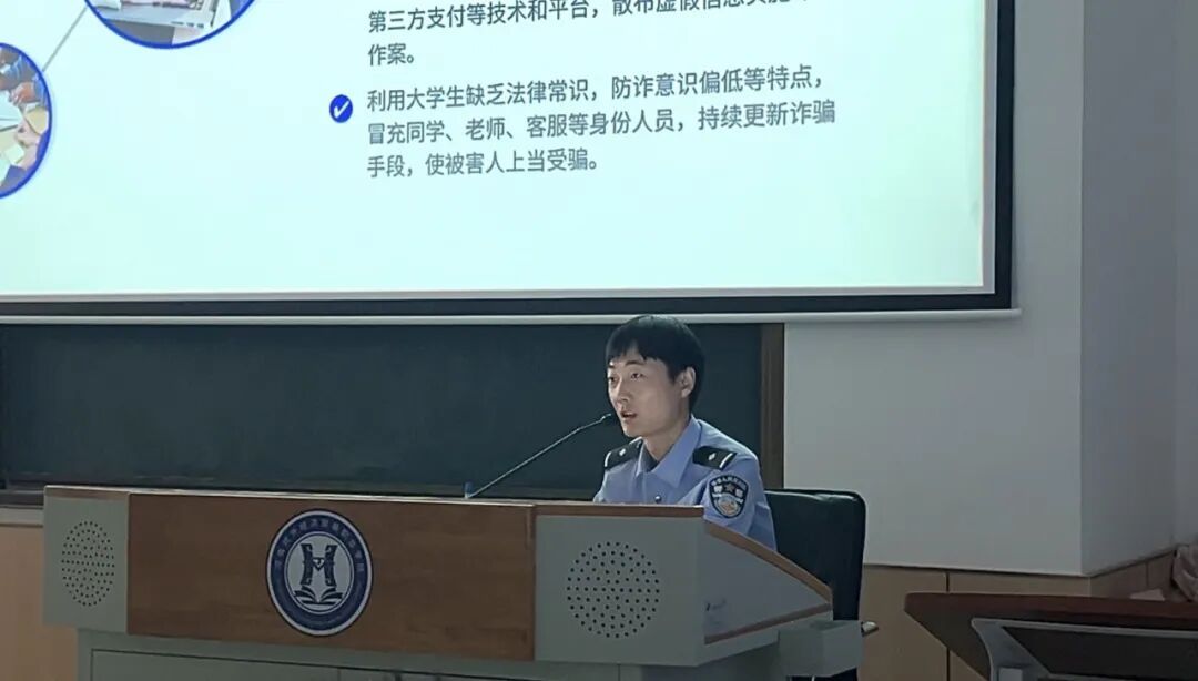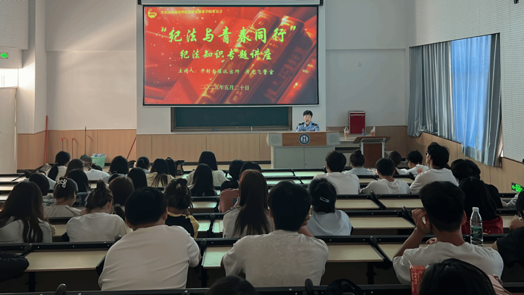 在“纪法与青春同行”纪法知识专题讲座现场,金耀派出所的厉龙飞警官结合自身丰富的执法经验,从防电信诈骗、防欺凌、治安管理法律法规等多维角度为同学们带来了一场干货满满的讲座。