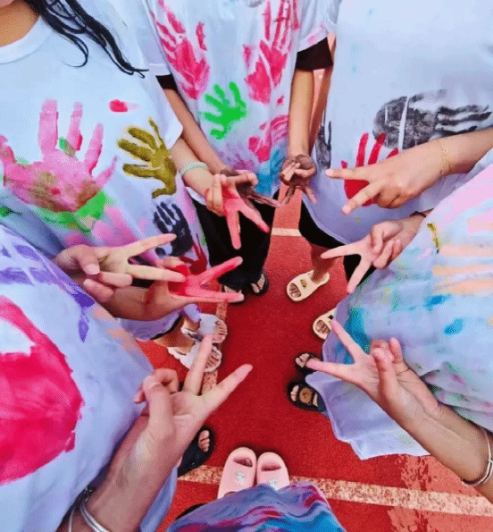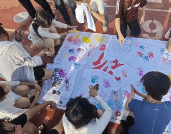激烈的"水战"间隙,同学们纷纷来到彩色手印区。蘸满颜料的手掌在纯白T恤和巨幅画布上留下个性印记。很快,五彩斑斓的手印就布满了整面背景墙,成为最受欢迎的拍照打卡点。