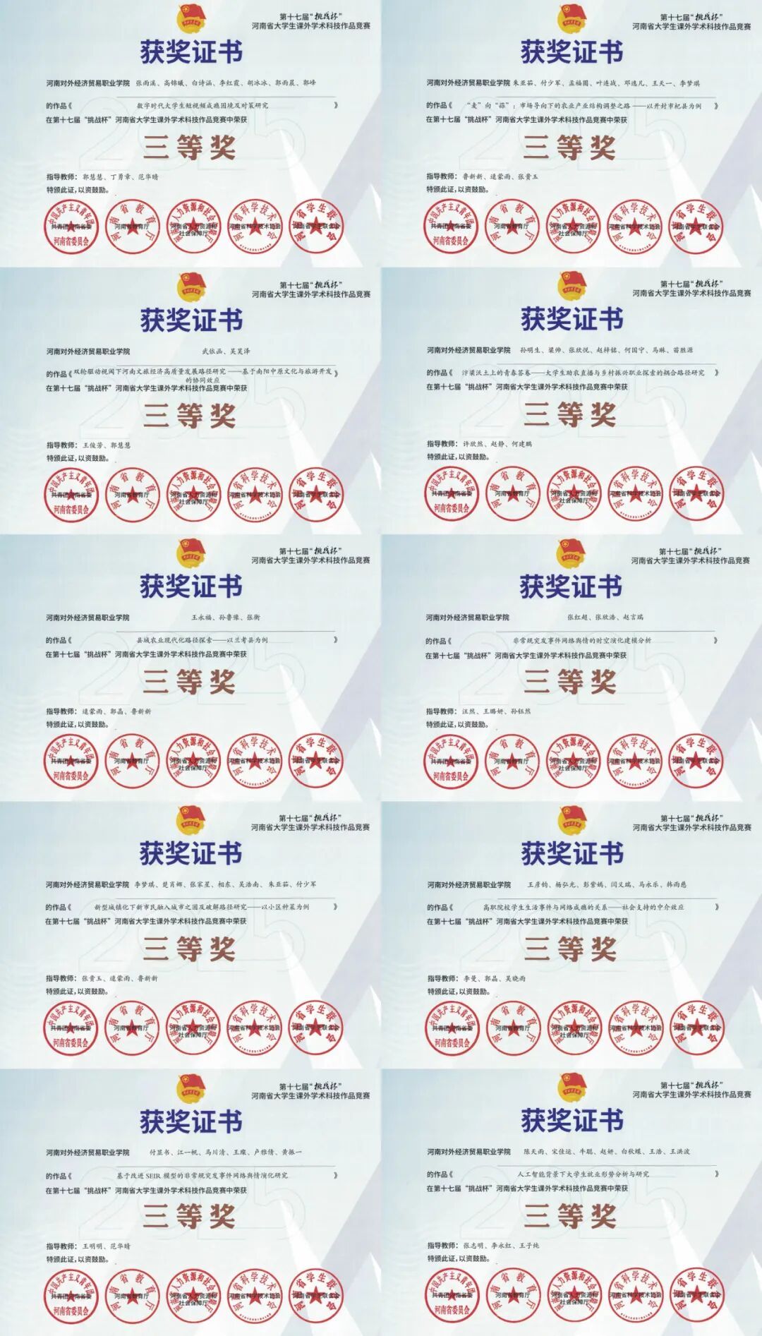 在第十七届“挑战杯”河南省大学生课外学术科技作品竞赛中,我校学子取得佳绩,共获特等奖1项、三等奖10项,充分展现出蓬勃的创新活力与奋进风采。为表彰先进、凝聚力量,12月26日,校团委在实训楼2011报告厅举行颁奖仪式。校党委书记程相仁、副校长董红军出席仪式。校团委书记、副书记、各学院团总支书记、指导教师与获奖学生共同参会,一起分享这份属于青年科创实践的荣誉与喜悦。