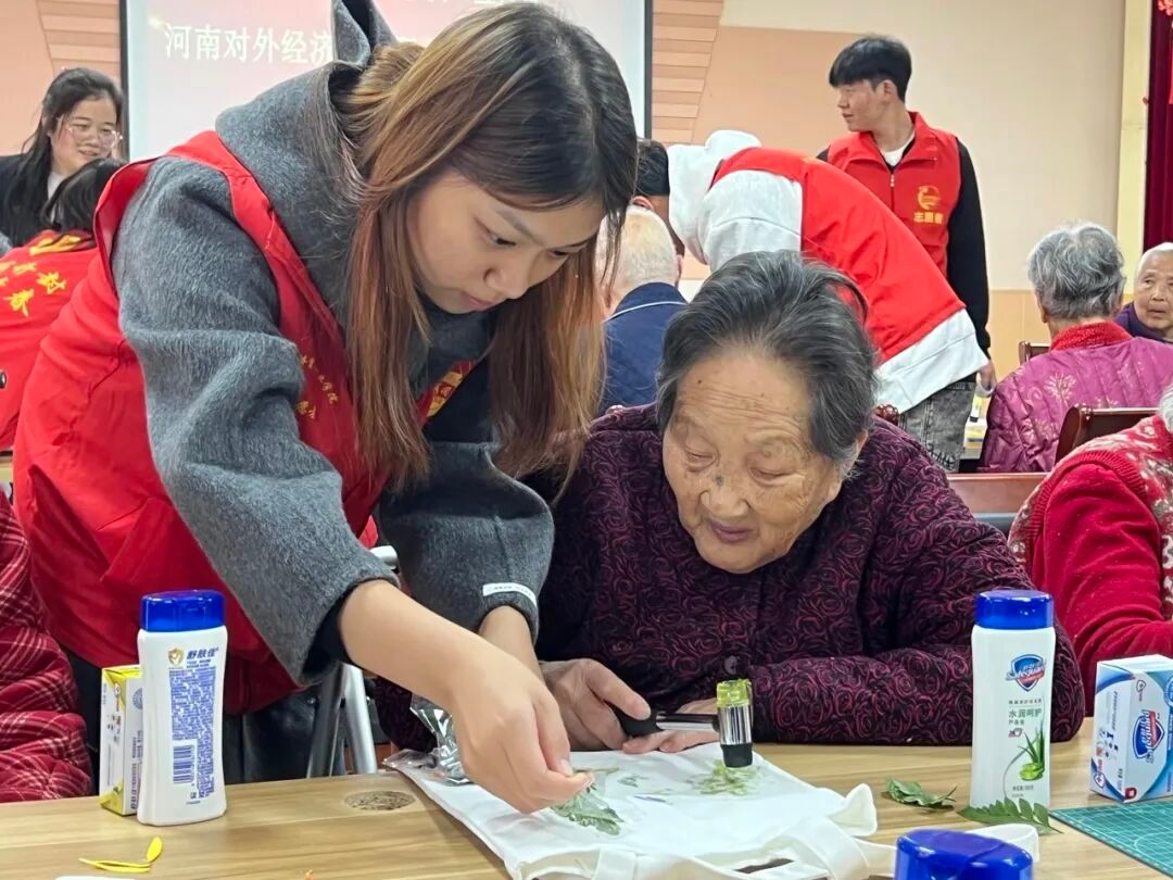 活动在老人们期盼的目光与热烈的掌声中拉开帷幕。志愿者们深情演唱多首经典老歌,并带领老人们同做健身操,现场气氛温馨而活跃。随后的趣味套圈比赛妙趣横生,欢笑声与喝彩声此起彼伏。在“植物拓印”手工环节,让老人们将秋叶繁花的自然印记永恒留存于帆布包上,创作出独具意义的节日纪念。