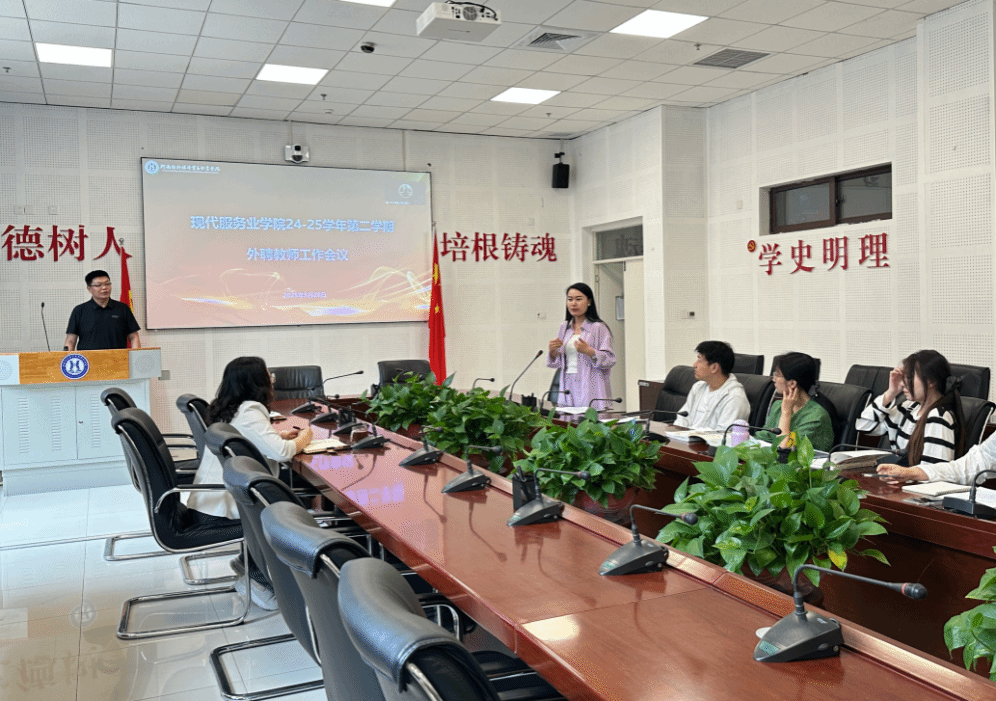 2025年5月28日,河南对外经济贸易职业学院现代服务业学院组织召开2024-2025学年第二学期外聘教师工作会议。现代服务业学院院长吴晓雨出席会议,学院教学管理团队及全体专业课外聘教师参会。会议围绕外聘教师管理制度学习、教学情况总结与问题反馈、教学交流等主题展开,旨在进一步规范外聘教师管理、提升教学质量、深化校内外教师合作。