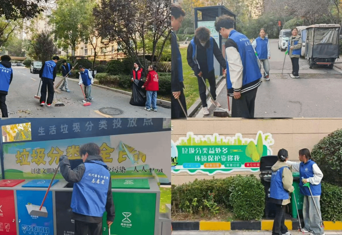 活动中,现代服务业学院的志愿者们以蓝色志愿马甲为标识,迅速融入社区服务:在垃圾分类宣传区,志愿者们结合社区点位的分类指引牌,用通俗的语言向居民讲解可回收物、厨余垃圾的区分技巧,现场演示分类投放规范,带动居民参与到“绿色社区”建设中;与此同时,另一组志愿者拿起清扫工具,对社区步道、绿化带内的落叶、杂物进行地毯式清理,弯腰捡拾角落垃圾、合力规整公共区域,让秋日的社区环境更显整洁清爽。