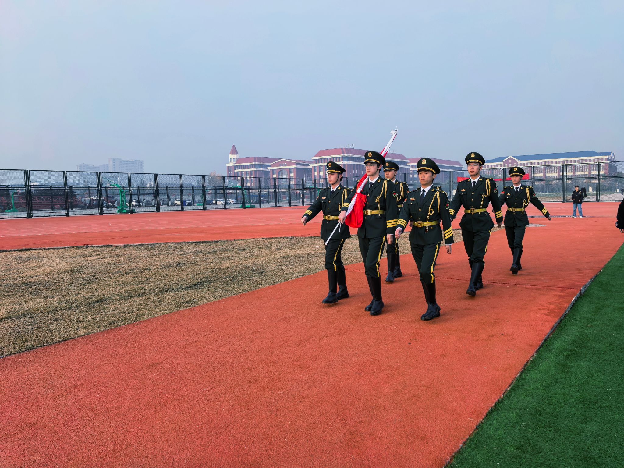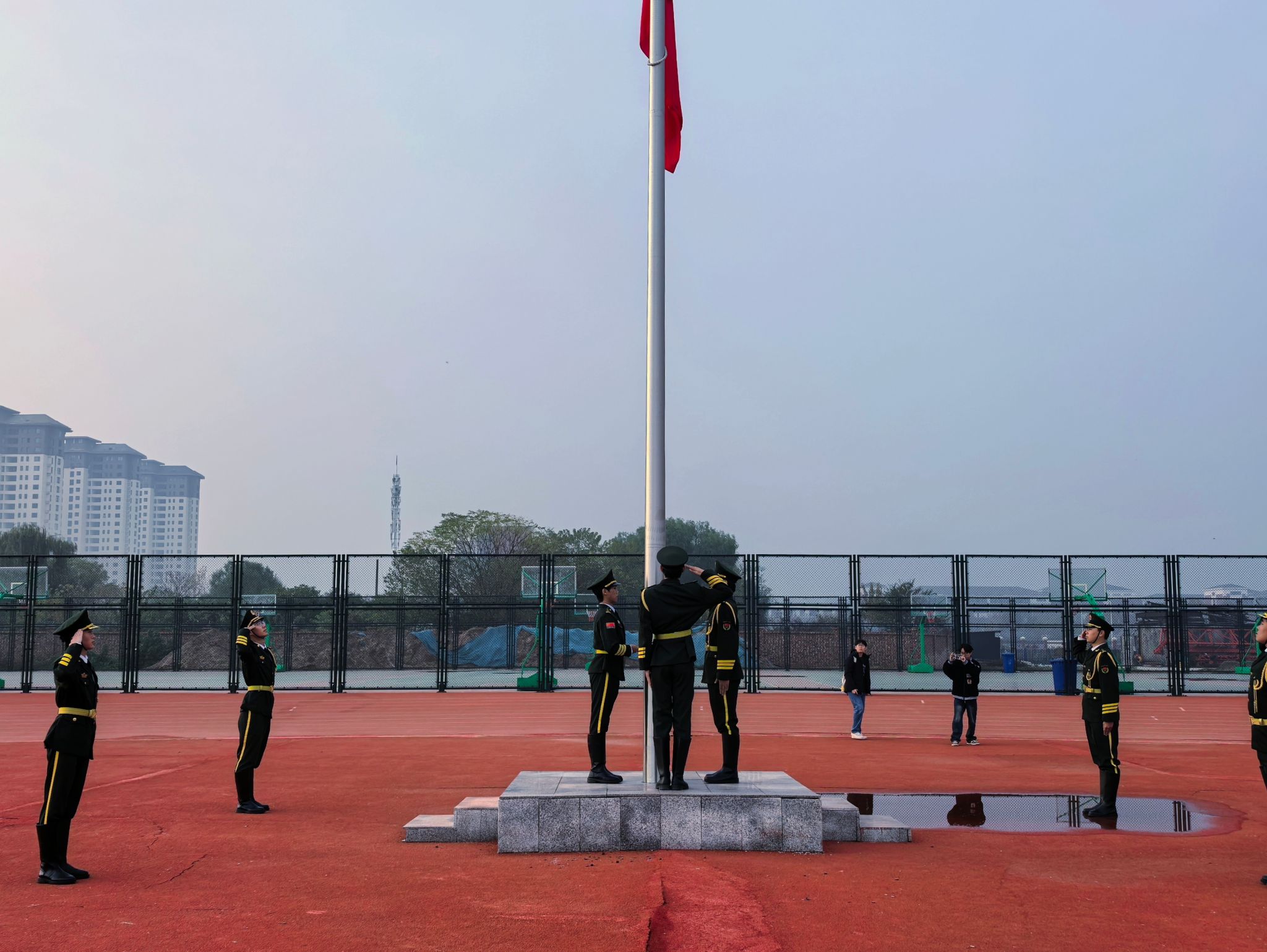 学院国旗护卫队的队员们身着藏青制服,肩护国旗迈着正步走向旗台——步点撞得整齐,哪怕风掀动衣角,身姿也没半分松懈。《义勇军进行曲》响起的瞬间,全场信工师生齐齐肃立,目光追着鲜红的国旗攀上杆顶,直到旗面在风里舒展,晨阳刚好裹住那抹红。