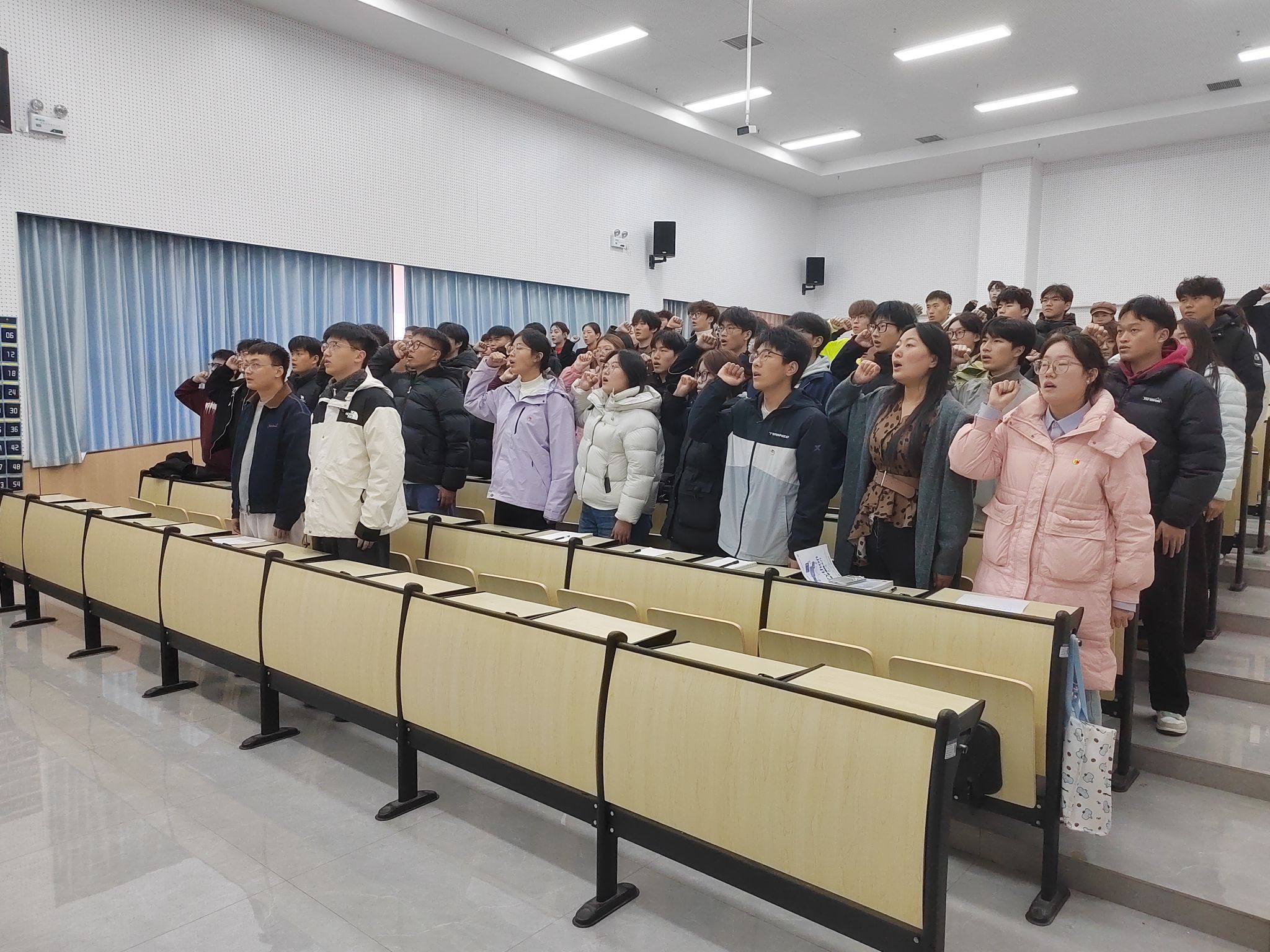 仪式在庄严的氛围中拉开序幕,主持人详细介绍了本次青马班的学员构成与培养规划后,宣布开班仪式正式启动。全体参会人员起立,奏唱中华人民共和国国歌,激昂的旋律凝聚起青年学子的爱国情怀与责任担当。随后,入团宣誓环节如期举行,学员们高举右拳,庄严重温入团誓词,铿锵有力的誓言回荡在会场,进一步坚定了大家听党话、跟党走的理想信念,牢记青年一代的使命与担当。