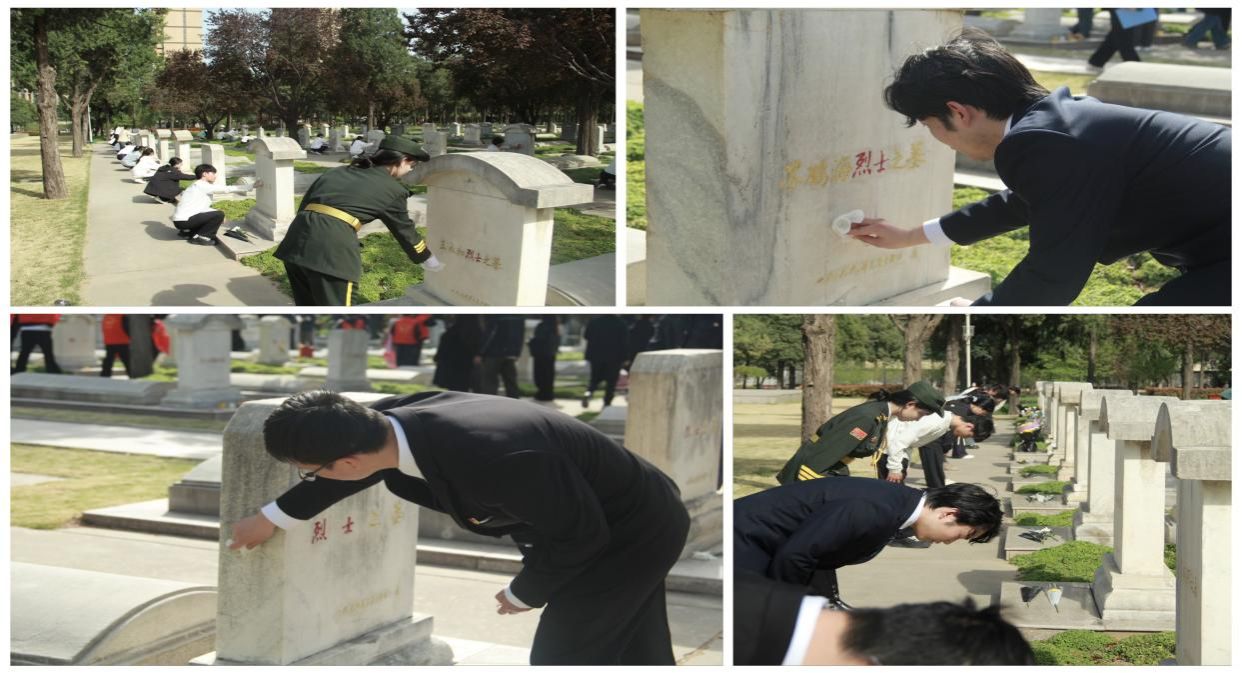 在烈士墓区,37名学生团员面向团旗重温入团誓词,铿锵誓言回荡林间。两院联合开展"写给先烈的一封信"活动,学生们将手写书信系于陵园纪念树,用中英双语表达传承之志。"您披荆斩棘换来的春天,我们接续奋斗!"应用外语学院董浩杰同学的信笺上如是写道。活动最后,师生共同擦拭烈士墓碑,以行动践行缅怀之情。